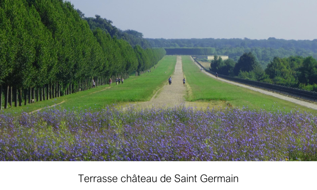 Nous parcourrons ensuite la longue terrasse (2 km) entre les jardins du château dessinés par Le Nôtre et la vallée de la Seine, avec une vue splendide sur Paris, La Défense, le Mont-Valérien.