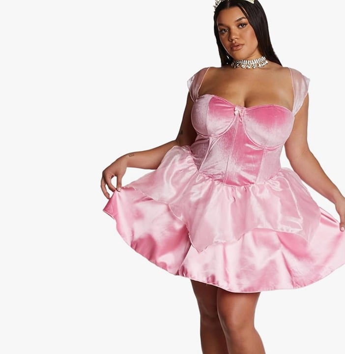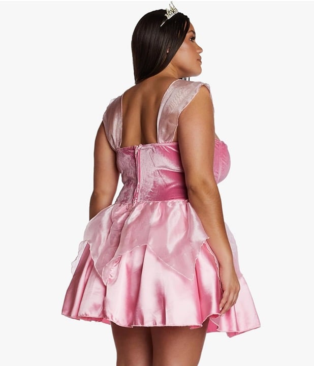 Complete Princess Look: This costume set includes a mini dress with a velvet bodice, organza sleeves, and ruffles at the waist, along with a satin skirt and a tiara for a regal appearance.