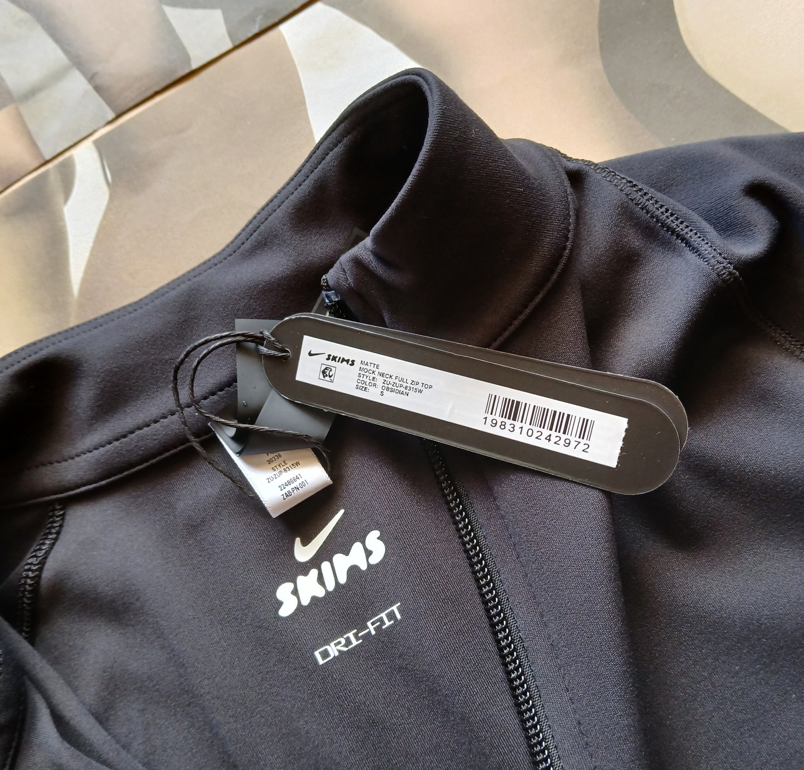NWT, unworn and 100% authentic NikeSKIMS Matte Mock Neck Full Zip Jacket in color Obsidian size Small.